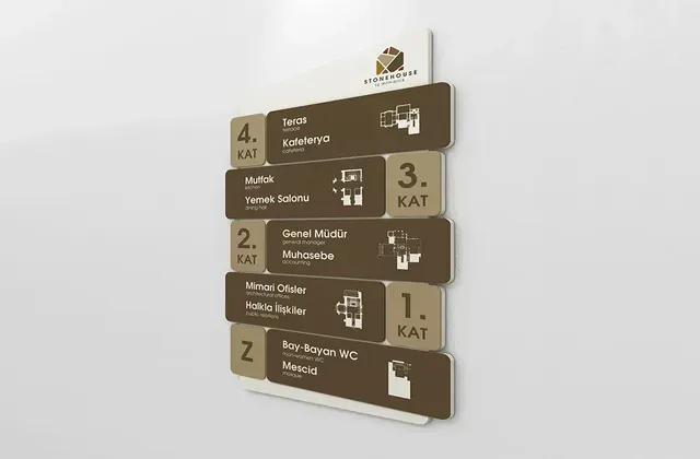 Bina içinde koridor, kat bilgileri, oda numaraları gibi bilgilendirme amacıyla kullanılır. Genellikle pleksi, alüminyum veya kompozit malzemeden yapılır. - Ayaklı Yönlendirme Tabelaları